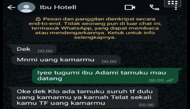 Dalam chat juga disebutkan bahwa pembayaran dilakukan dengan “top up ke ibu hotel”, yang seolah menjadi fasilitator praktik kotor ini.